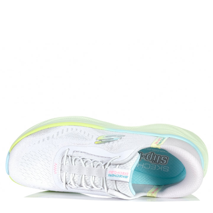Bring cloud-like cushioned comfort to your sporty routine wearing Skechers Hands Free Slip-ins Skech Cloud - Perfectly Plush. Designed with our exclusive Heel Pillow, this breathable vegan style features a monomesh upper with stretch laces, a well-cushioned midsole, and a Skechers Air-Cooled Memory Foam insole.
