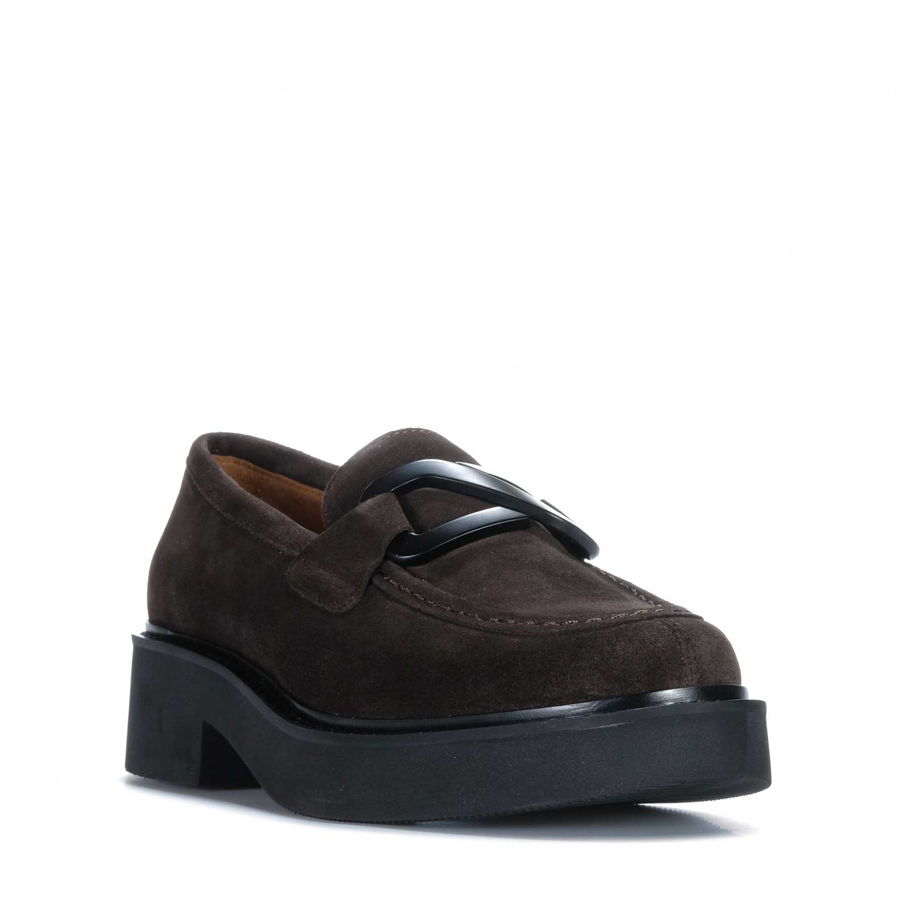 Polished and modern, The EOS Leia leather loafer is set on a bold platform base that adds height with a clean, streamlined look. The leather upper is finished with a statement metal link across the vamp, while a full leather lining provides a more natural feel against the foot. A lightweight manmade outsole keeps the profile easy to wear while offering dependable grip, and the 40mm heel height delivers a confident lift with a stable stance.